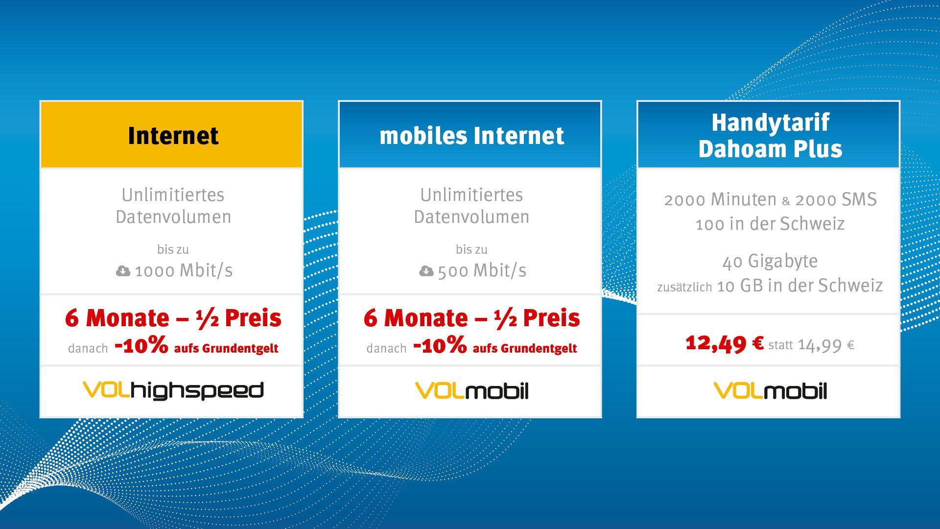 Als MitarbeiterIn von Russmedia erhältst du die Internettarife von VOLmobil und VOLhighspeed die ersten 6 Monate zum ½ Preis und danach bekommst du dauerhaft -10 % Rabatt auf die Grundgebühr.
